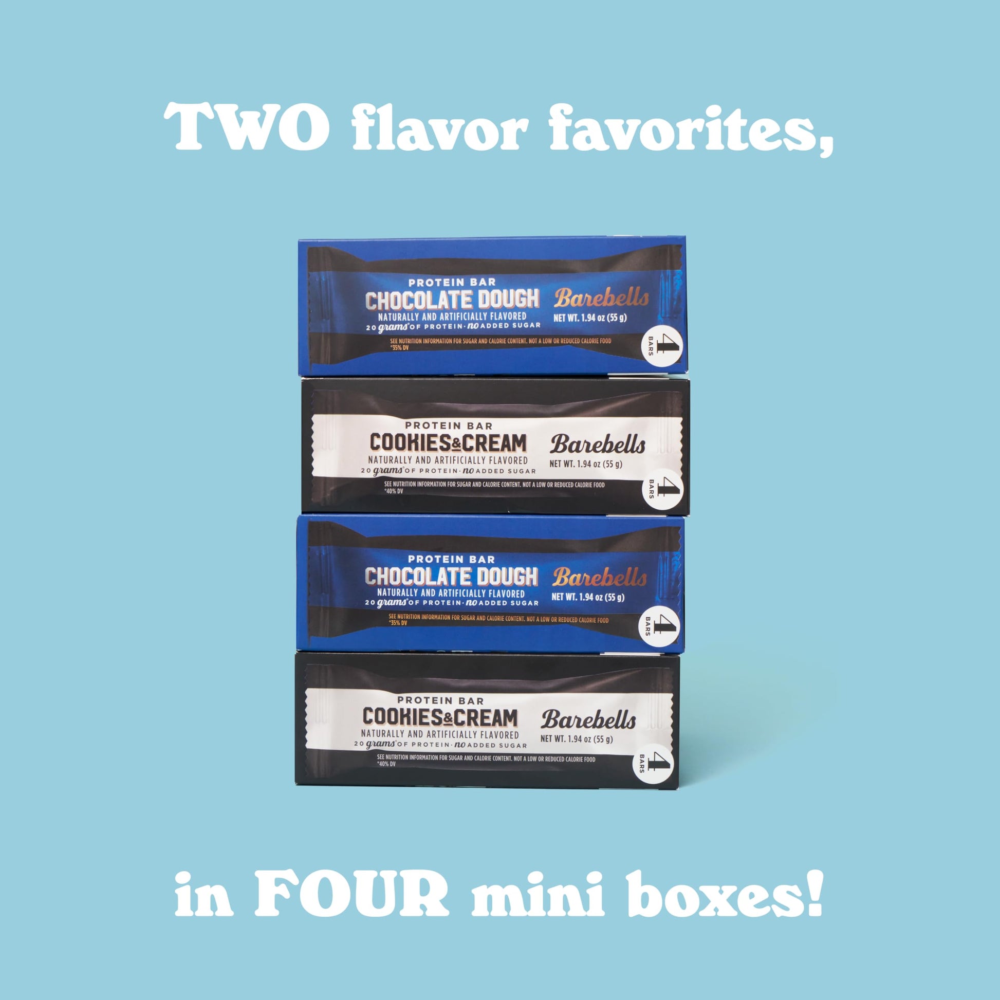 - BAREBELLS VARIETY VALUE PACK PROTEIN BARS - 16 individual yummy Barebells protein bars! Tired of eating bars that taste like cardboard? Our protein bar variety pack is a delicious mix of some of our fan favorite flavors, all with 20 grams of protein – (8) Cookies & Cream, (8) Chocolate Dough.
